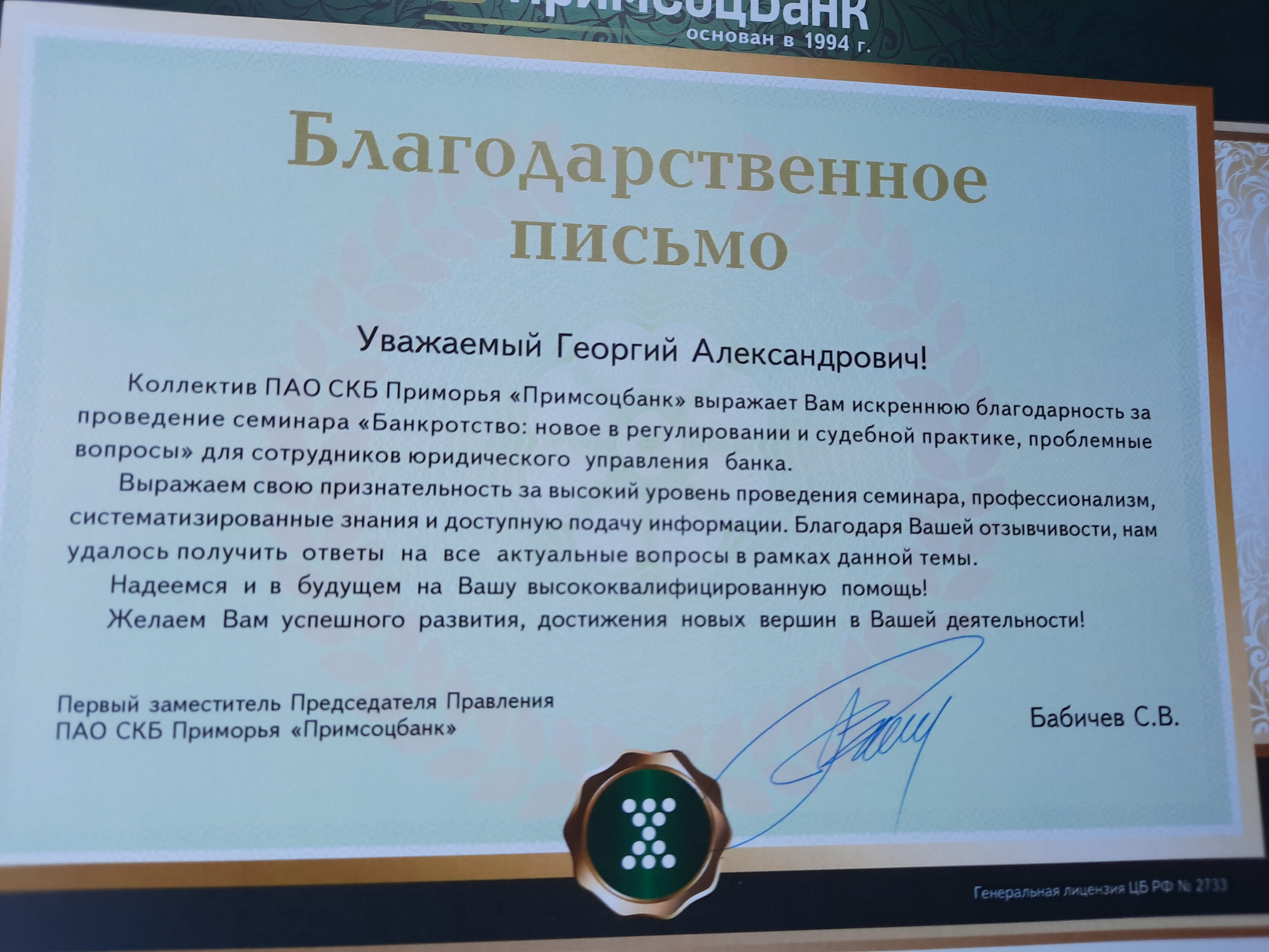 Благодарственное письмо от уполномоченного при Губернаторе Архангельской области по защите прав предпринимателей за проведение семинара заместителем директора филиала НП "МСО ПАУ" в ПФО Евстюничевевым А.В. и арбитражным управляющим Кузьминым А.Ю. Подробнее...>>>